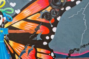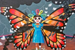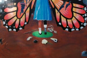 Ses grandes ailes de Monarque écorchées sont parées à l’envol malgré les blessures.