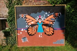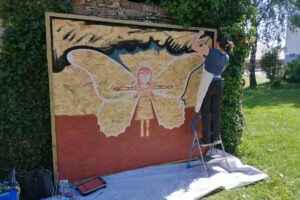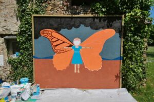 Exposée jusqu’à septembre 2025 dans le jardin du Presbytère.          (peinture acrylique sur panneau OSB 2,10M x 2,50M)