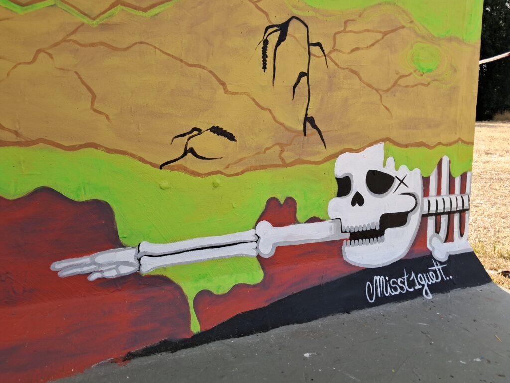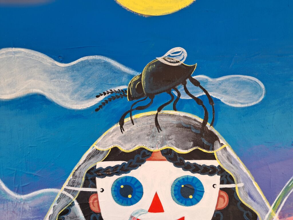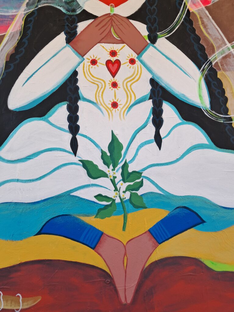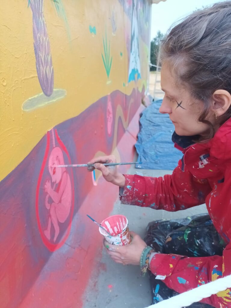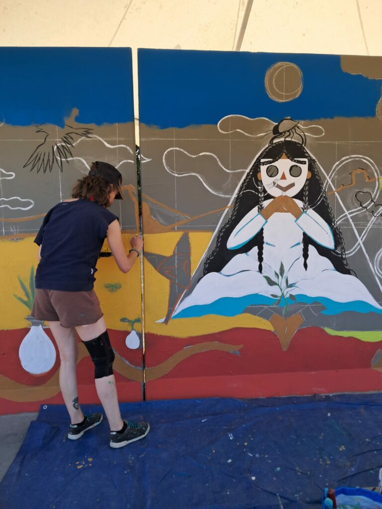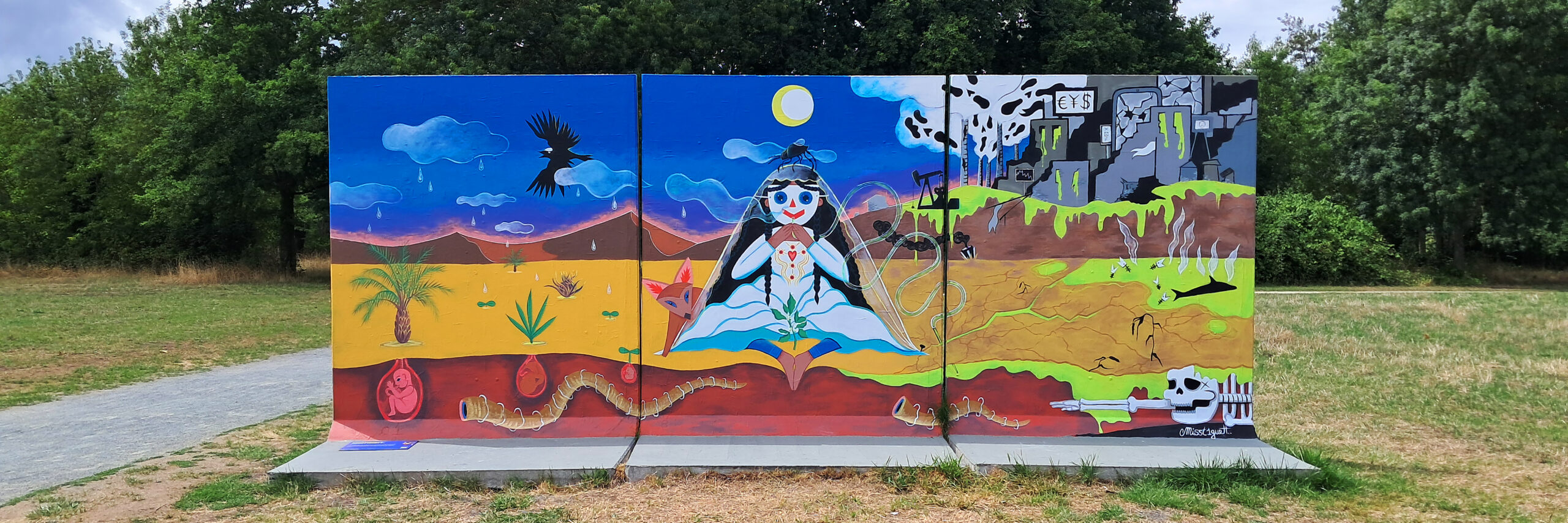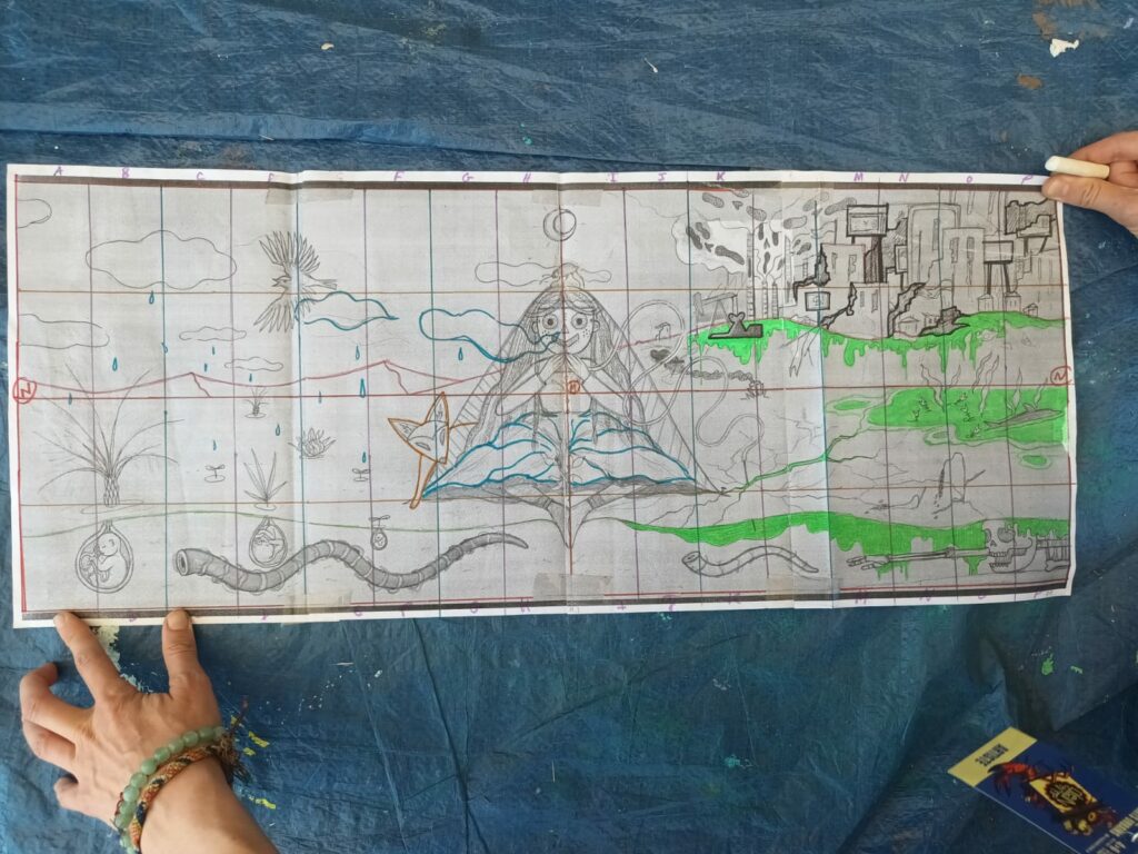 Au centre : Niña, sereine, les pieds plantés dans le sol telle une plante, avale la Mort et expire la Vie. Sous elle, naviguent deux vers des sables ayant fuit le vieux monde. Une référence à Dune mais aussi à nos vers terrestres qui permettent d’aérer et de fertiliser le sol.