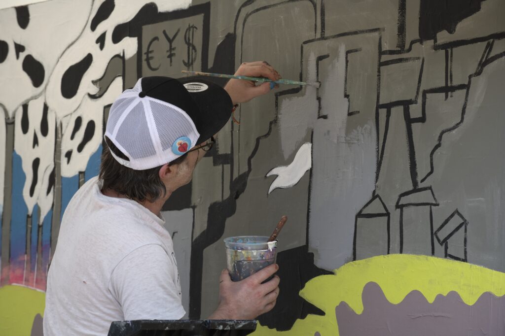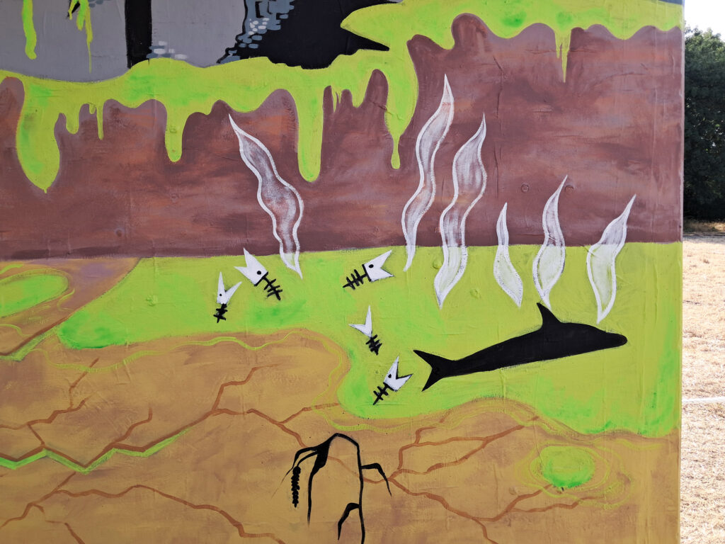 À droite : Un monde en ruines, qui est allé aux confins des extrêmes : pollution, surexploitation, sur-consommation, guerres, … Le poison s’est infiltré sous-terre. Un être humain a tenté de s’échapper par une galerie sans y parvenir.